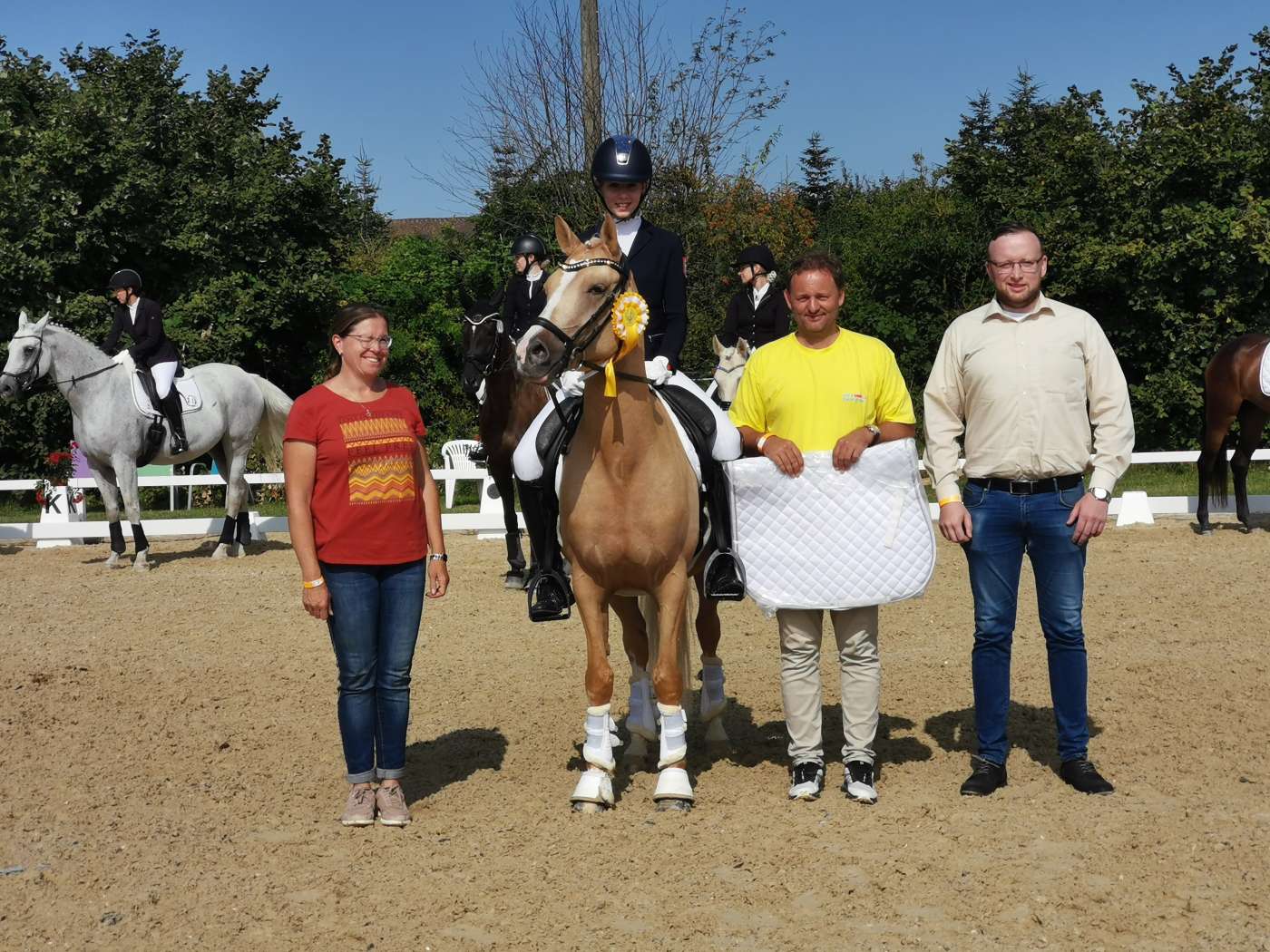 Über den Siegerpreis -eine Satteldecke- freut sich die Reiterin Greta Friederike Schmitt von der Reitsportgemeinschaft Homburger Kronenhof e.V. mit ihrem hübschen Palomino-Hengst Golden Prince WE. Die Glückwünsche überbringen (v.l.) Kerstin Schmitz vom ausrichtenden Wetterauer Reitverein e.V. sowie von der FDP Friedberg Vorstandsmitglied Helge Müller und Vorsitzender Ralf Maurer.